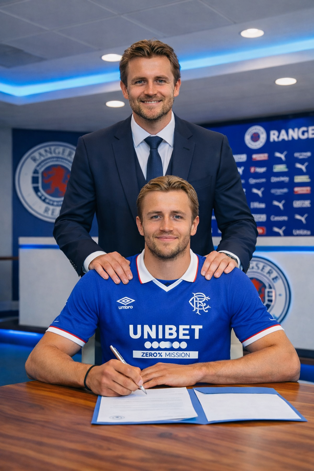 Rangers supporters are in full celebration mode after a powerful behind-the-scenes image emerged showing the player already seated at the table, pen in hand, and dressed in full Rangers colours during what looks like a contract signing meeting. With a club official standing proudly behind him, the photo has sent social media into meltdown, with many fans convinced the deal is now completely done.