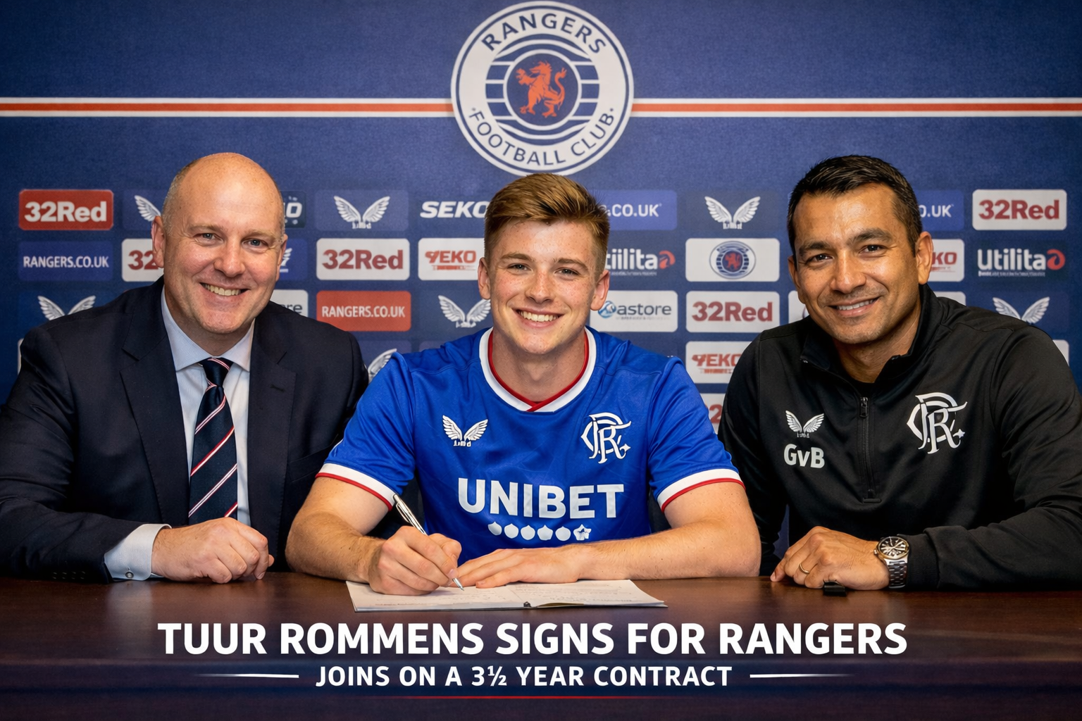 The youngster was pictured today putting pen to paper in a landmark moment, proudly wearing the new Rangers UNIBET jersey, as club officials sealed the agreement and final paperwork — making the move fully official and confirmed.
