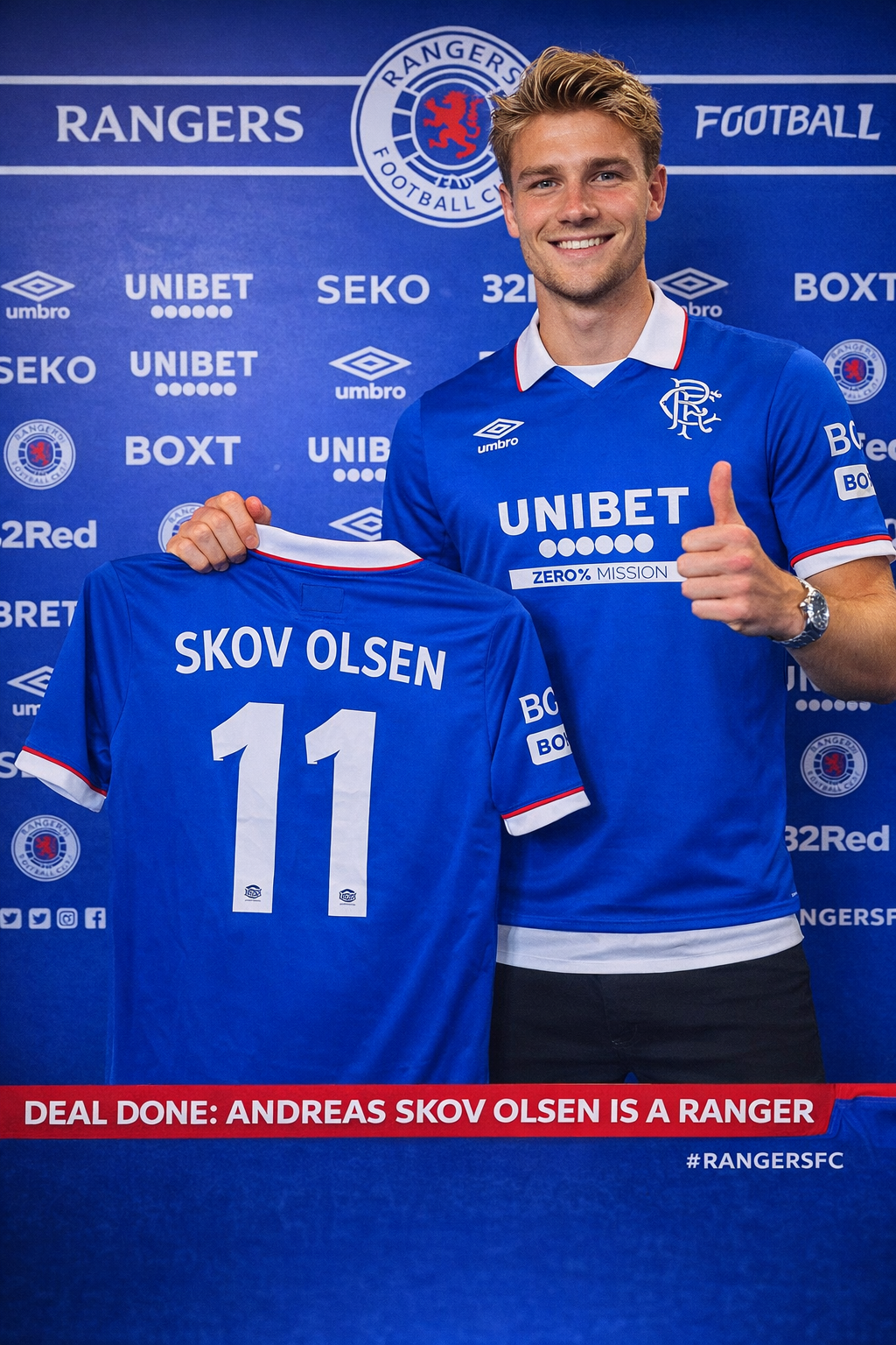 The Danish international was unveiled wearing the club’s new UNIBET-sponsored home jersey, proudly holding up his Rangers shirt with “SKOV OLSEN” on the back, marking the completion of what many supporters are already calling one of the best deals of the window.