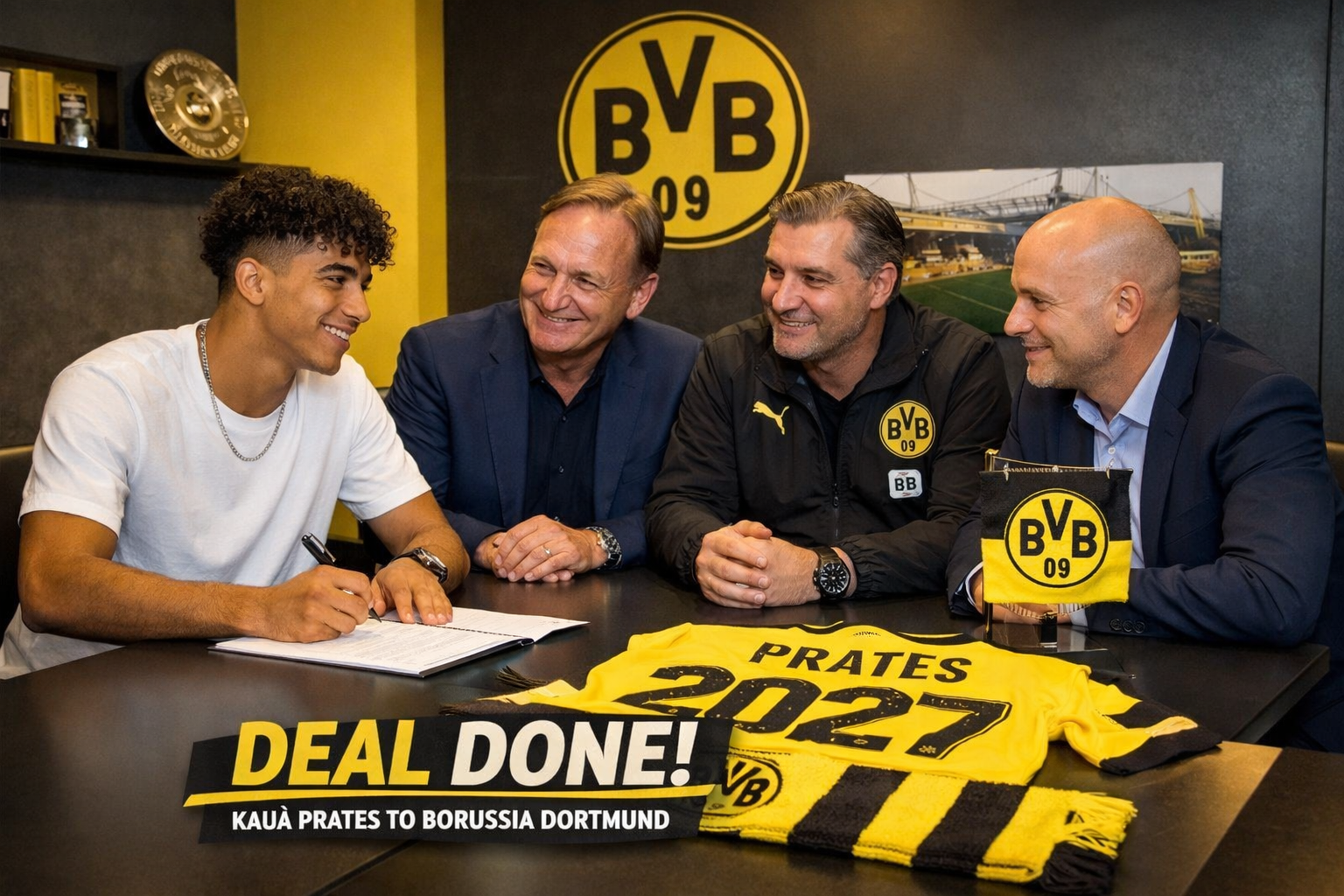 Auf dem Bild ist Prates in den Dortmunder Farben zu sehen, wie er sich mit wichtigen Funktionären von Borussia Dortmund während des letzten Treffens zum Abschluss des Transfers zusammensetzt, wobei der Spieler den Wechsel zu Papier bringt.