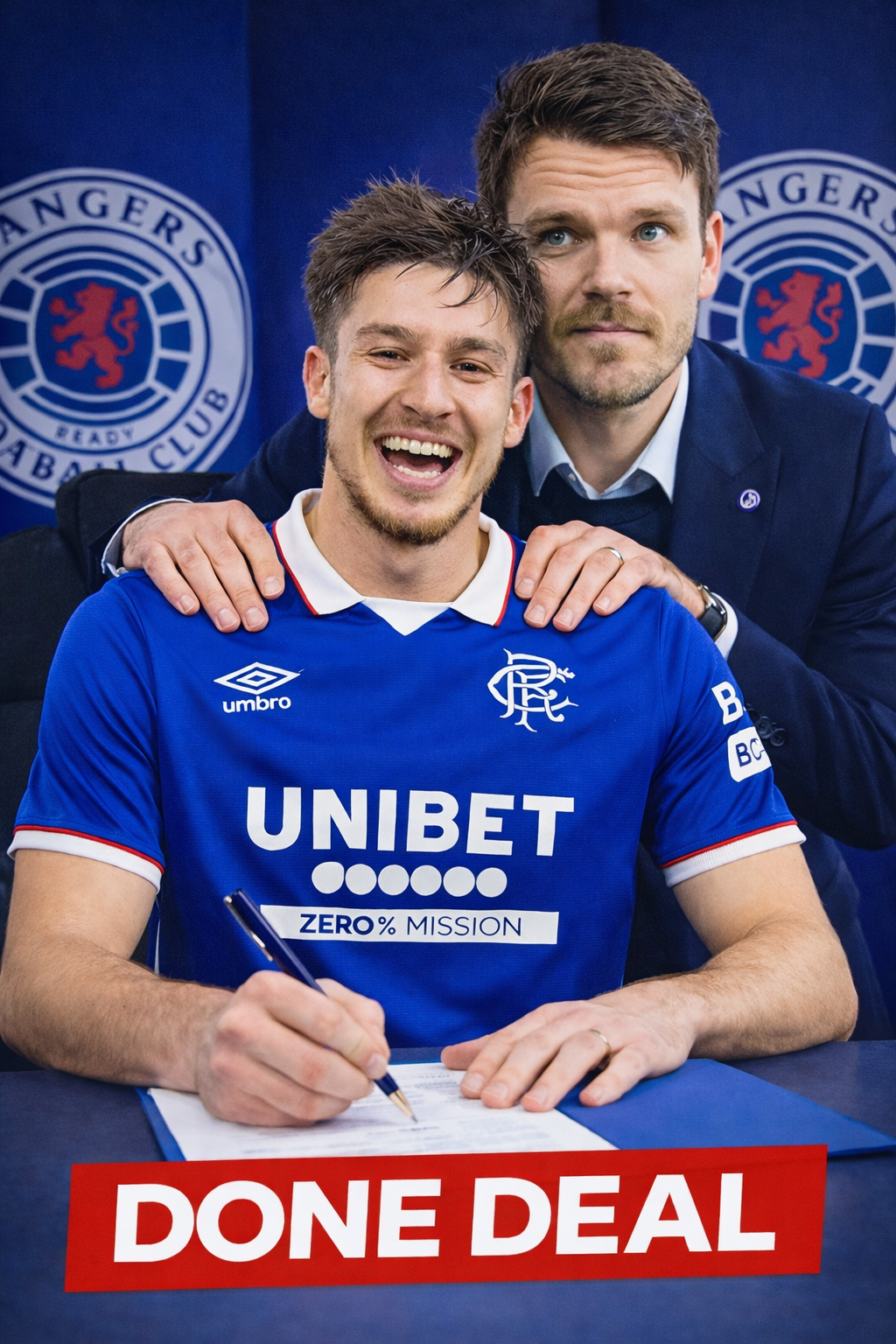 The young forward was pictured today signing his contract in Rangers colours, marking the final step of his move to the club. Standing proudly behind him was head coach Danny Rohl, who placed his hands on the player’s shoulders in a symbolic moment of trust and belief as the paperwork was finalized.