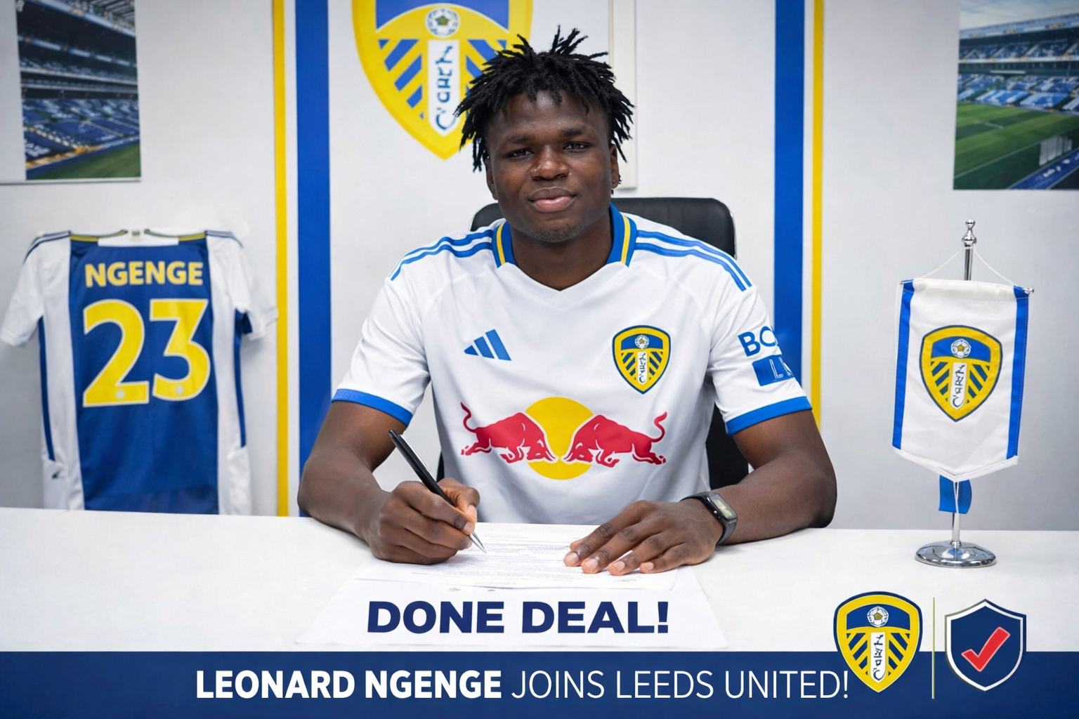 The image shows Ngenge proudly signing his contract while wearing the iconic Leeds United white jersey, a clear signal that the deal has now been sealed. The 23-year-old arrives as part of Leeds’ push to strengthen their squad with young, energetic talent capable of making an immediate impact.